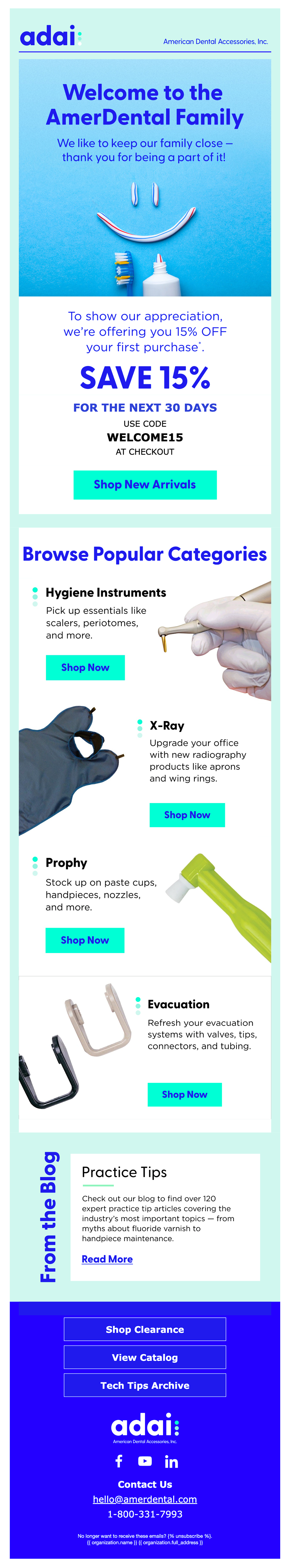 We partnered with American Dental Accessories with the goal of leveraging digital marketing to drive greater scale and revenue. For the email channel, I gave their email designs a total refresh to better reflect their brand and values and entice both new and existing customers to shop with them.